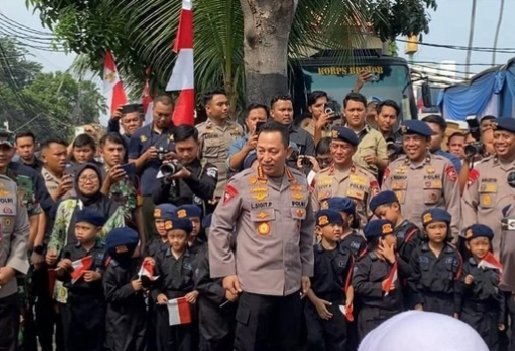 Kedatangan Kapolri disambut hangat oleh anak-anak TK berseragam Brimob, yang akrab disebut “Brimob Cilik”.