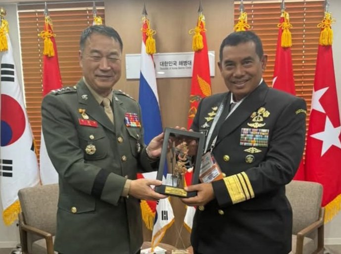 Panglima Korps Marinir (Pangkormar) Letnan Jenderal TNI Dr. Endi Supardi,S.E.,M.M.,M.Tr. Opsla.,CHRMP.,CRMP.,melaksanakan courtesy call dengan Komandan Republic of Korea Marine Corps (ROKMC),Letnan Jenderal Ju Ill Seok, bertempat di International Exhibition Center,Seoul,Korea Selatan,pada Selasa (21/10/2025).
