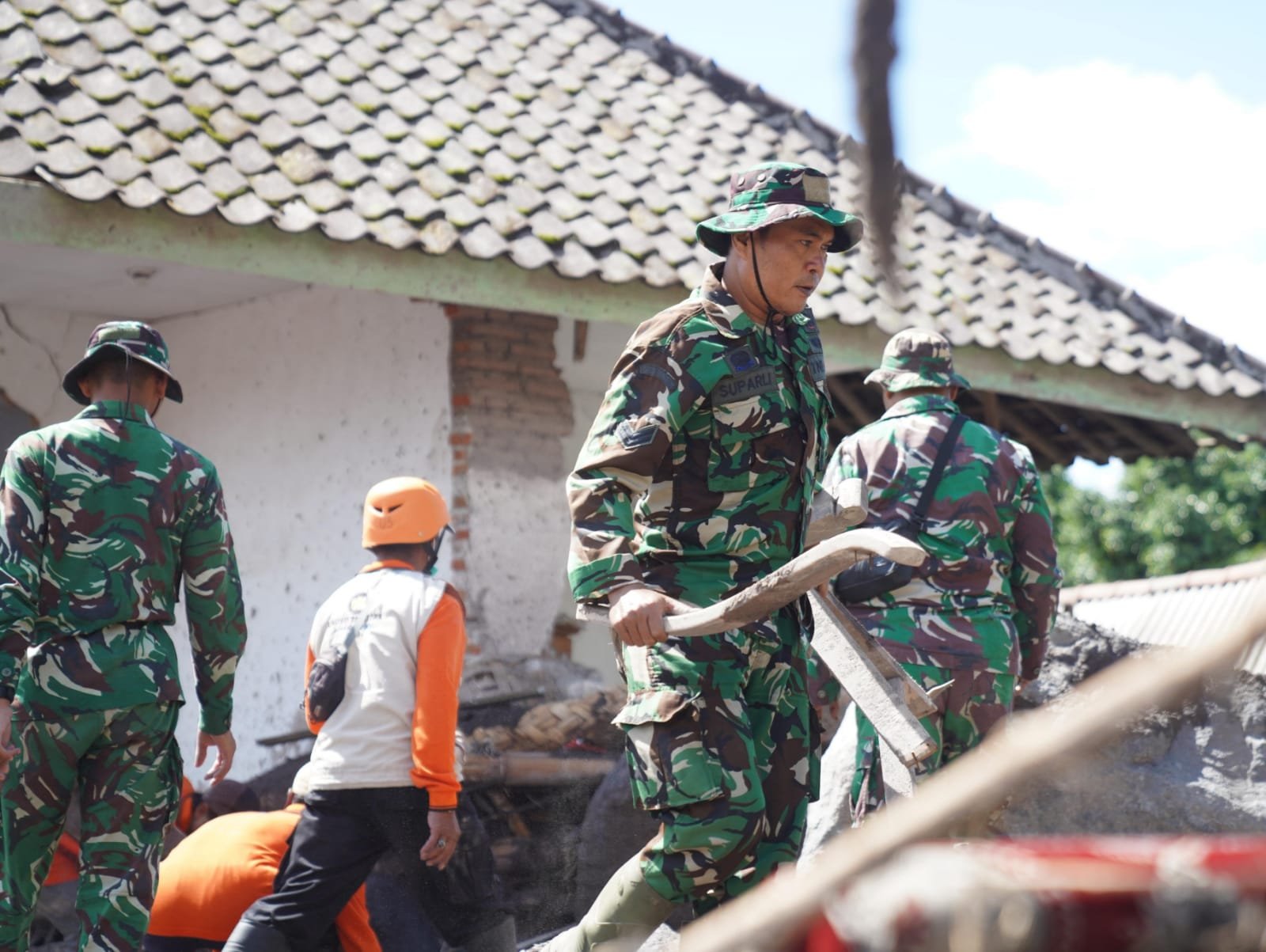Personel Zeni TNI AD juga terus melakukan pembersihan jalur dan fasilitas umum dari abu vulkanik dan material lahar menggunakan alat berat,sekaligus memperbaiki sarana vital seperti jembatan darurat dan akses jalan untuk mempercepat mobilitas bantuan.