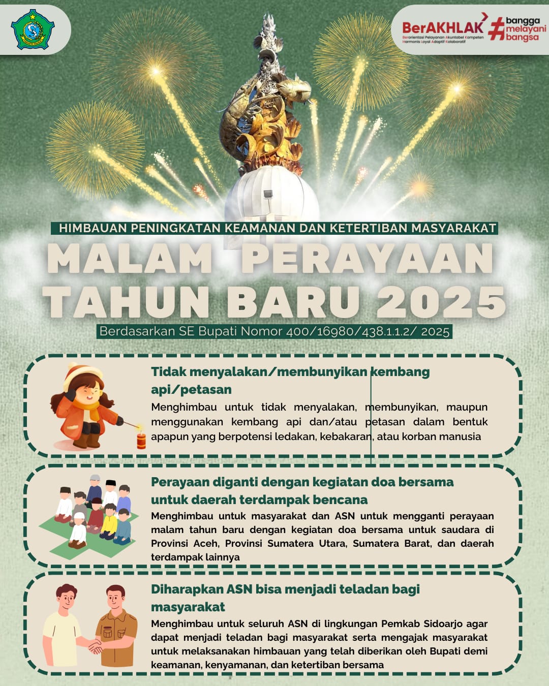 Bupati Sidoarjo menerbitkan Surat Edaran Nomor 400/16980/438.1.1.2/2025 tentang Peningkatan Keamanan dan Ketertiban Masyarakat pada Malam Perayaan Tahun Baru 2025.