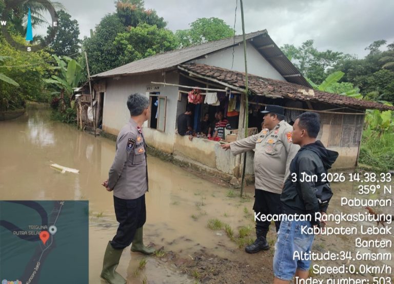 Terasistana.id Lebak – Kepala Sentra Pelayanan Kepolisian Terpadu (KSPKT) III Polsek Rangkasbitung Polres Lebak, AIPDA Danu Nugraha bersama AIPDA Wahyu Zjatmiko, melaksanakan kegiatan pengecekan rumah warga yang tergenang air akibat meluapnya Sungai Ciujung di Kampung Carelang, Desa Kolelet Wetan, Kecamatan Rangkasbitung, Kabupaten Lebak, Sabtu (03/01/2026).