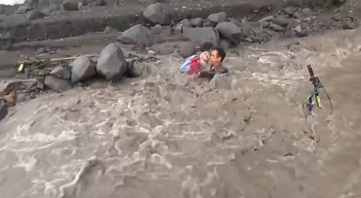Begitu motor mereka menyentuh air, arus deras banjir lahar langsung menyeret motor beserta keduanya hingga sejauh lebih dari 5 meter.
