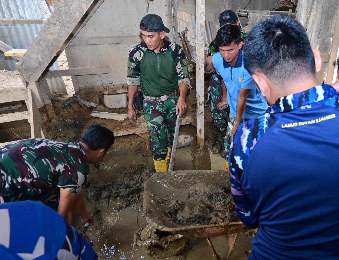 Sejumlah personel Lanud diterjunkan untuk membersihkan rumah-rumah warga,jalan umum,serta fasilitas lingkungan lainnya yang terdampak banjir. Kegiatan dilaksanakan secara terkoordinasi dan terpadu agar kawasan permukiman kembali bersih dan layak digunakan.