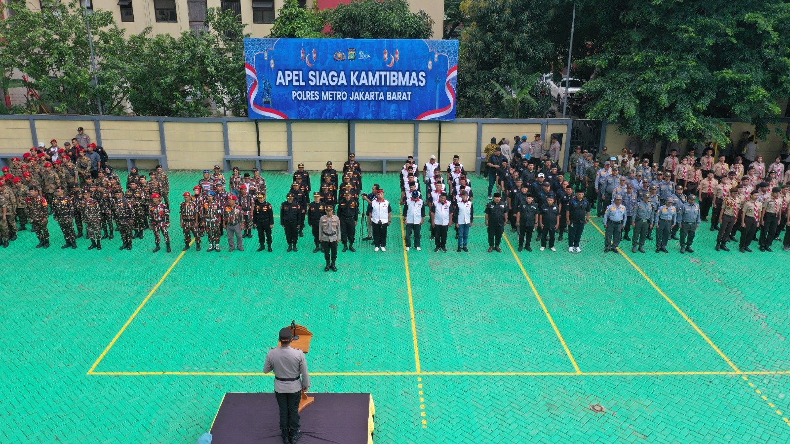 Polres Metro Jakarta Barat menggelar Apel Siaga Kamtibmas bersama seluruh perwakilan organisasi kemasyarakatan (ormas) yang berada di wilayah Jakarta Barat, di Lapangan Hijau Polres Metro Jakarta Barat, Kamis (26/2/2026).