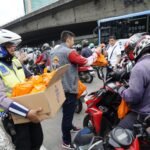 Sebanyak 5.000 paket makanan siap saji dibagikan kepada pengendara roda dua maupun roda empat.