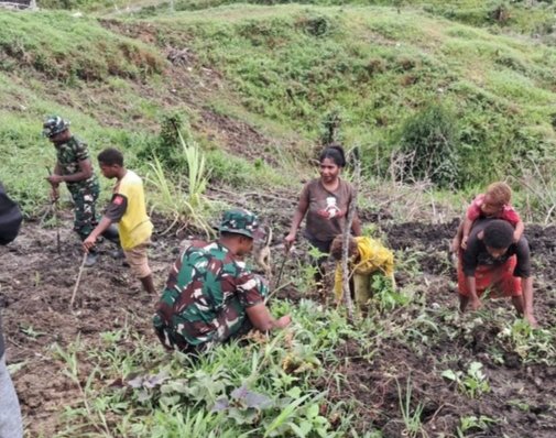 Pos Parim Yonif 751/Vira Jaya Sakti (VJS) Satgas Swasembada bersama masyarakat melaksanakan kegiatan bercocok tanam sebagai upaya menumbuhkan ketahanan pangan sekaligus mendorong kemandirian ekonomi warga.