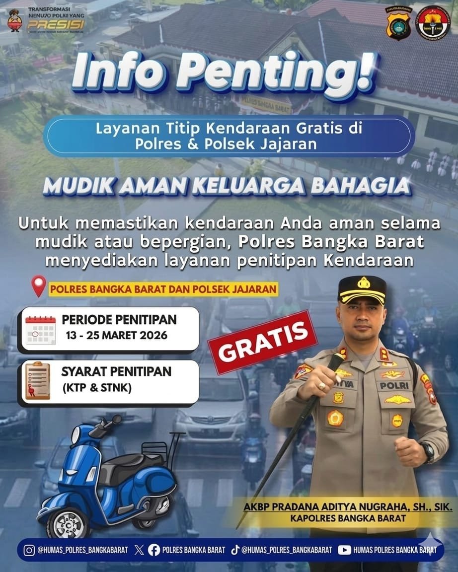 ” Layanaan ini lkami siapkan untuk membantu masyarakat Bangka Barat yang ingin mudik atau bepergian. Kendaraan bisa titipkan secara geratis di polres Bangka Barat maupun di seluruh Polsek jajaran, ” ujar Kapolres Minggu ( 15/3/2026).