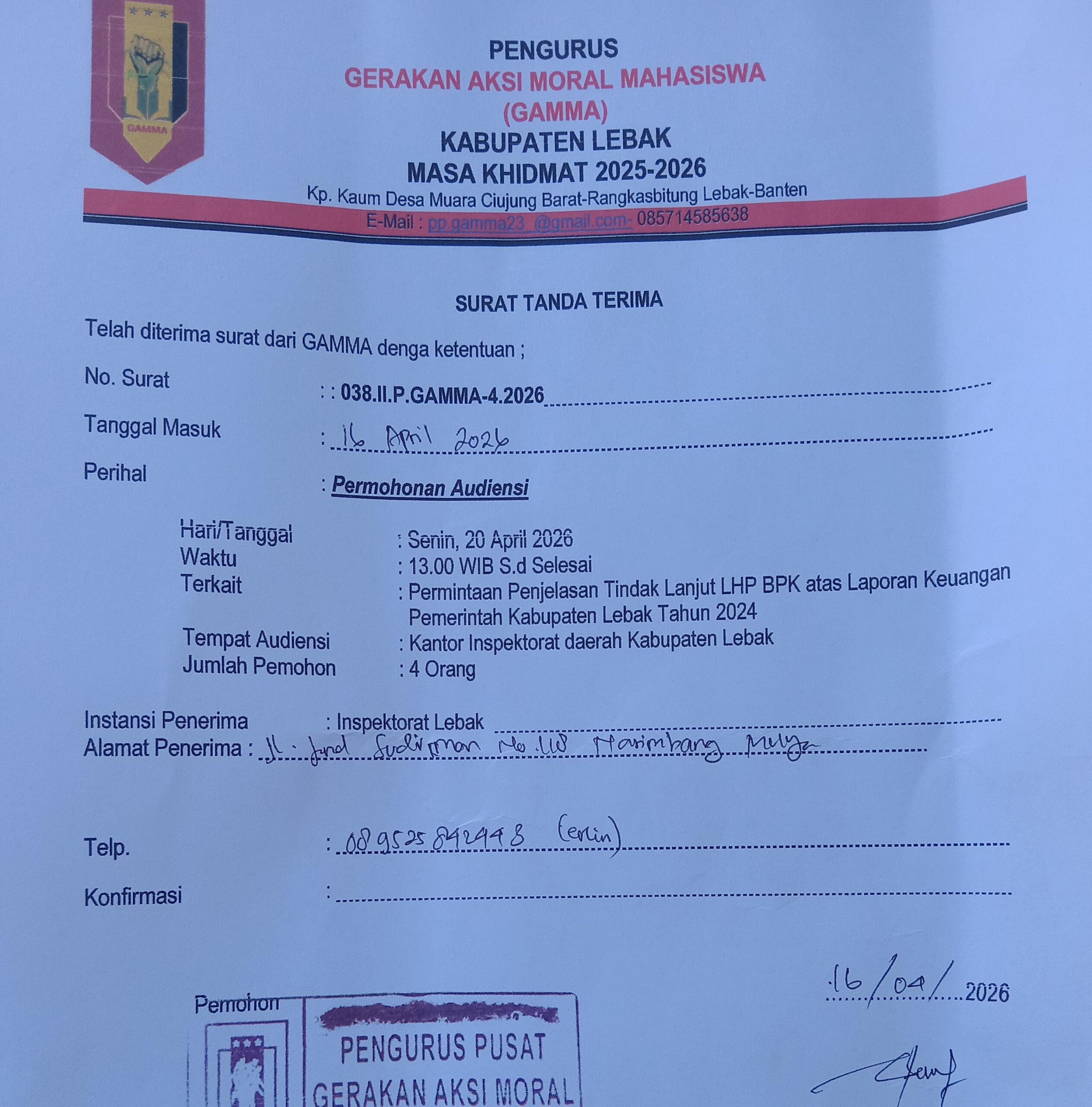Terasistana.id Lebak – Gerakan Aksi Moral Mahasiswa (GAMMA) Kabupaten Lebak secara resmi melayangkan surat permohonan audiensi kepada Inspektorat Kabupaten Lebak, Kamis (16/4/2026). Sebagai bentuk keseriusan dalam mengawal tindak lanjut temuan Badan Pemeriksa Keuangan Republik Indonesia (BPK) Perwakilan Provinsi Banten.
