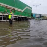 Tidak Hanya Lakukan Pengalihan Arus Lalin Saja, Polrestabes Semarang Juga Bantu Warga Lintasi Genangan Air Kaligawe – Genuk